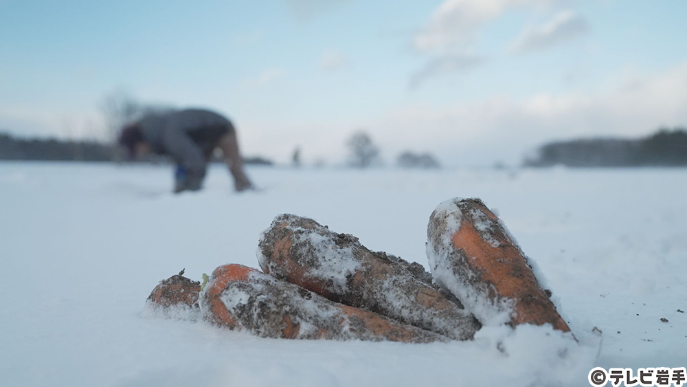 北上市の雪深い畑の下に眠る「雪下にんじん」。冬に収穫することで甘みが増すのが特徴。